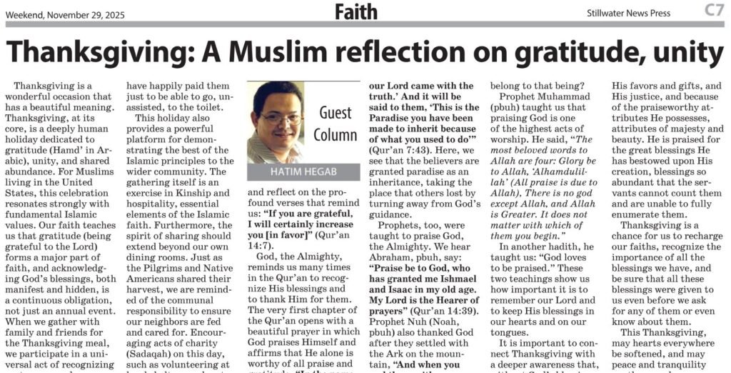 Saturday, November 29, 2025, marked the publication of my 100th weekly article in the Stillwater News Press (SNP), a milestone that fills me with gratitude and joy. For one hundred consecutive weeks, I have been writing about Islam, love, unity, and solidarity, with the hope of building bridges of understanding and compassion within our community.…