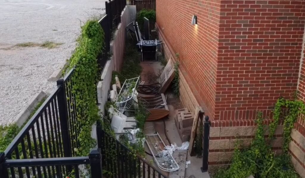 The deteriorated landscaping and uncleaned back stairs area