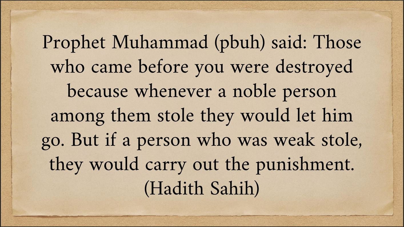 “إِنَّمَا هَلَكَ الَّذِينَ مِنْ قَبْلِكُمْ أَنَّهُمْ كَانُوا إِذَا سَرَقَ فِيهِمُ الشَّرِيفُ تَرَكُوهُ وَإِذَا سَرَقَ فِيهِمُ الضَّعِيفُ أَقَامُوا عَلَيْهِ الْحَدَّ”